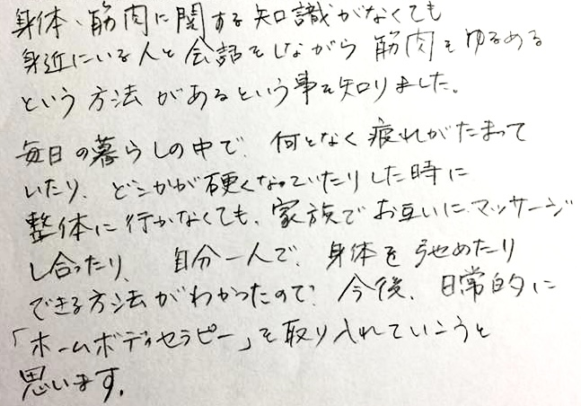 毎日の暮らしの中で、何となく疲れがたまっていたり、どこかが硬くなっていたりした時に、整体に行かなくても、家族でお互いにマッサージし合ったり、自分一人で、身体を弛めたりできる方法がわかったので、今後、日常的に「ホームボディセラピー」を取り入れていこうと思います。 -