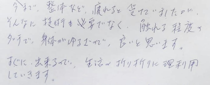 今まで、整体など、疲れると受けていましたが、そんなに技術が必要でなく、触れる程度のタッチで、身体がゆるむので、良いと思います。すぐに出来るので、生活の折折に利用していきます。